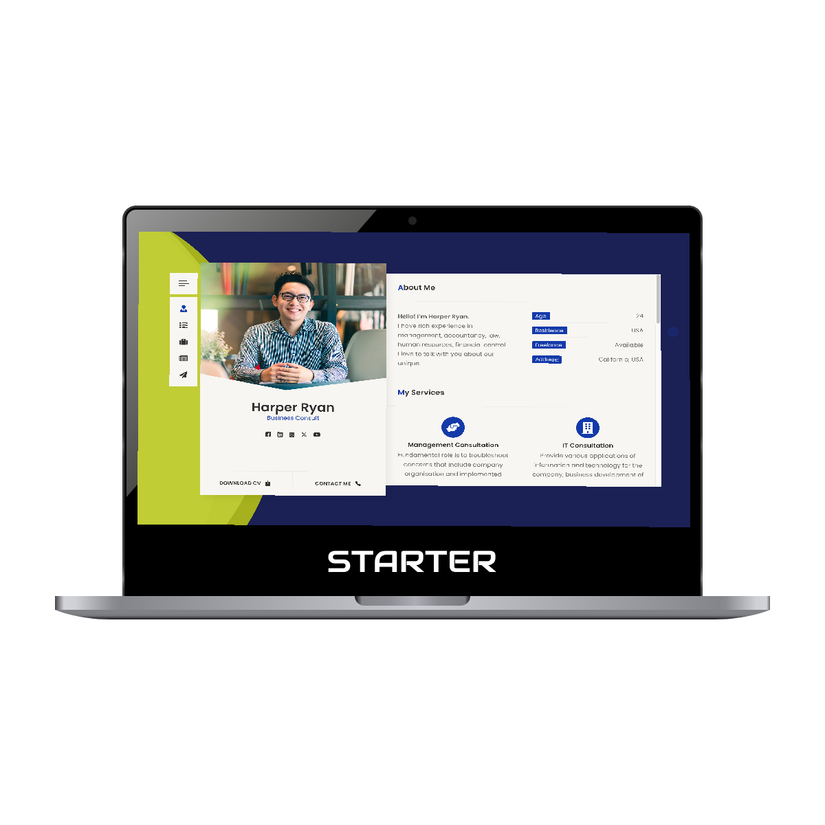 Con il Pacchetto Starter realizziamo per te un CV digitale su misura, basato sulle informazioni che ci fornisci: dati personali, esperienze lavorative, formazione, link social, eventuali foto e ogni altro contenuto rilevante per la tua immagine professionale.